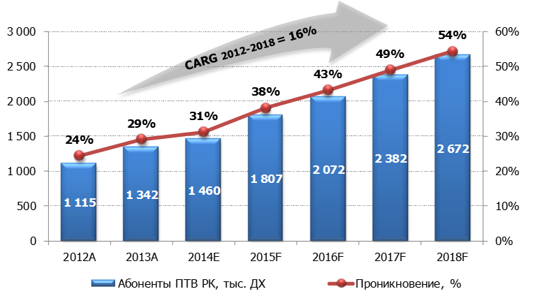 За 2014 год количество абонентов в стране увеличилось на треть и составило почти 1,5 млн. Это феноменальные темпы по сравнению с Россией, но отгадка проста — текущее проникновение составляет только 31% от всех домохозяйств. Поэтому по нашим прогнозам бурный рост продолжится и к 2018 году абонентская база платного телевидения Казахстана может достигнуть 2,7 млн ДХ (охват более 50%).