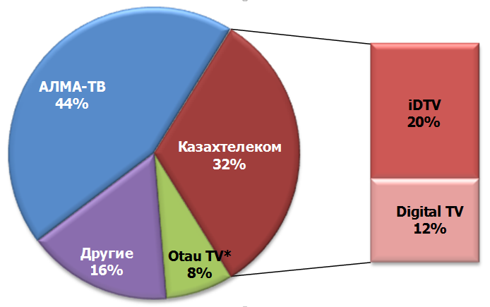 • АЛМА-ТВ (крупнейший оператор аналогового кабельного телевидения). Это старейший игрок, доля которого в абонентах наибольшая — около 44% по итогам 2014 года.
