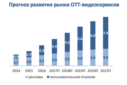 К 2021 году объем рынка ОТТ-видеосервисов составит 11,4 млрд руб., на доходы от платных сервисов будет приходиться две трети выручки. Средние темпы роста рынка (GAGR) в ближайшие 5 лет составят 10,4%.