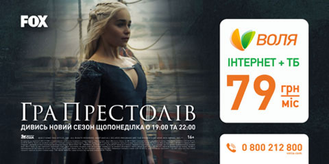 Крупнейший оператор платного ТВ Украины "Воля" запустил 360-кампанию, приуроченную к премьере сериала. Кампания включала в себя наружную рекламу и digital, а также PR-активности. 17 городов Украины были завешаны имиджем "Игры Престолов", которую, конечно, нужно и можно смотреть на Fox.