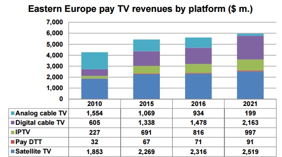 Несмотря на то, что в ближайшие пять лет число новых пользователей платного ТВ в Восточной Европе вырастет не более чем на 1 млн, выручка от услуг платного телевидения в период с 2015 по 2021 год должна увеличиться на 9,9%, до $5,97 млрд, уверены аналитики Digital TV Research.