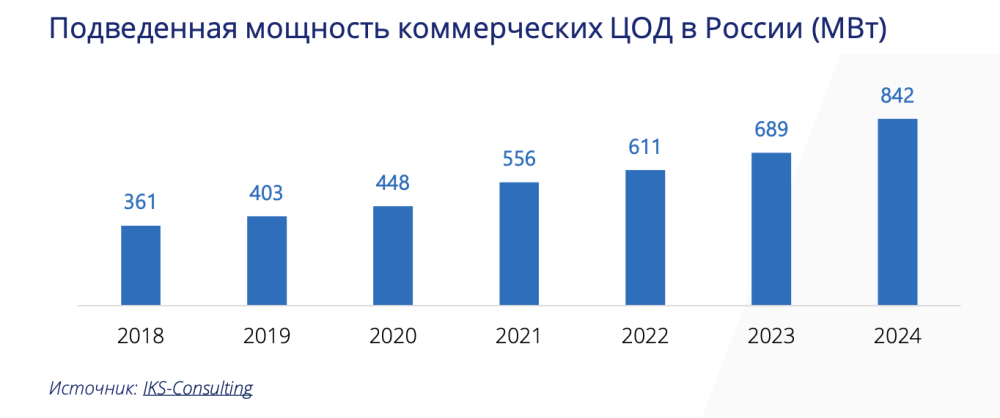 На апрель 2024 года ЦОДы использовали около 2,6 ГВт, что составляет 1% от установленной мощности Единой энергосистемы (ЕЭС) России. Ожидается, что потребление в этом сегменте вырастет на 30–40% в год.
