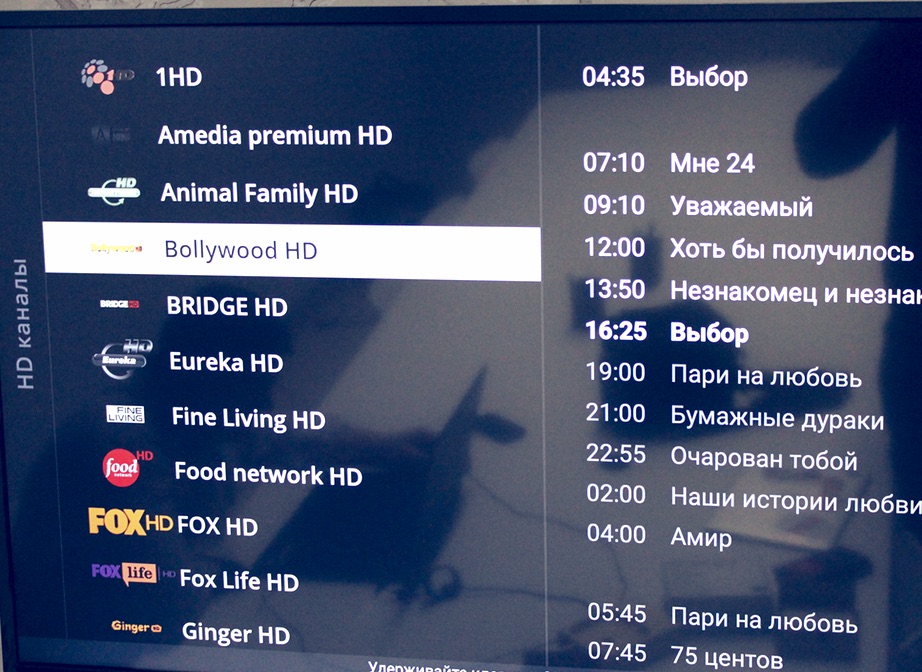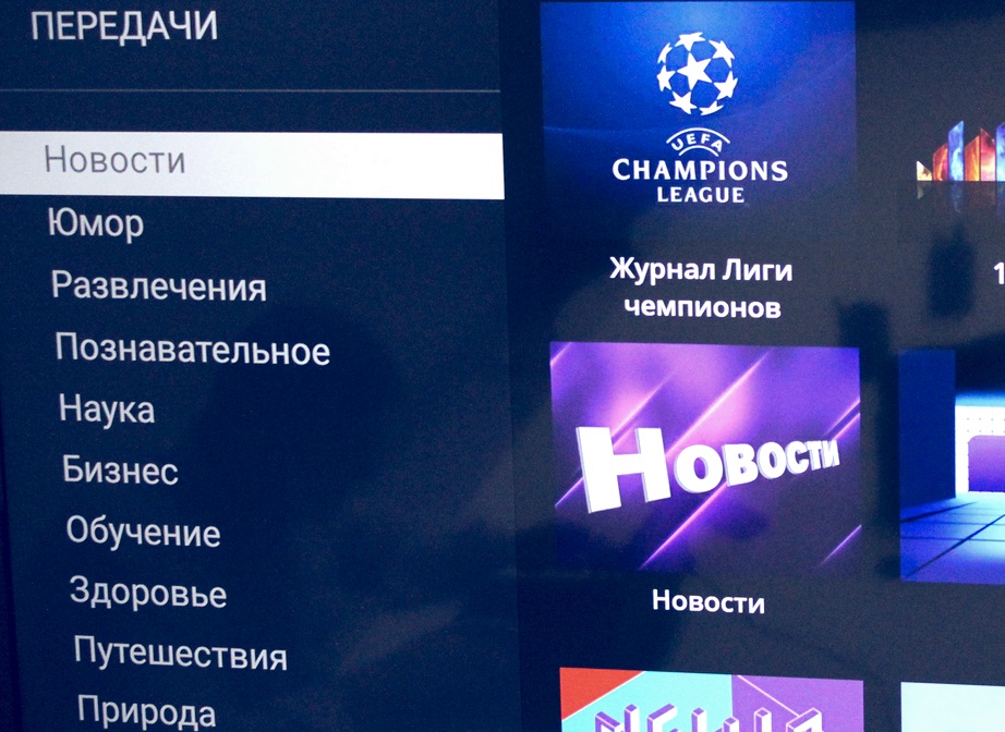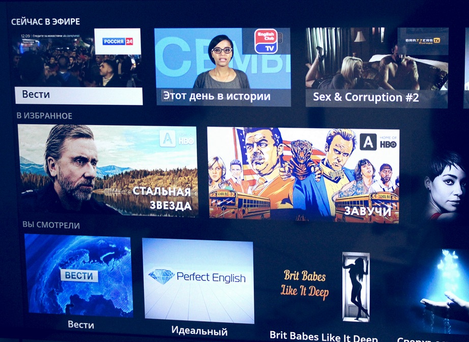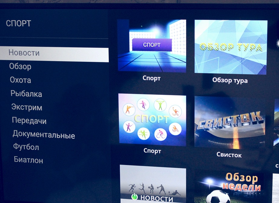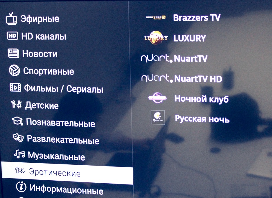 "ТВ эфир", в свою очередь рубрицируется на "новости", "спорт", "детские" и все такое. Эротика, само собой. HD каналы вынесены почему-то в отдельный раздел.