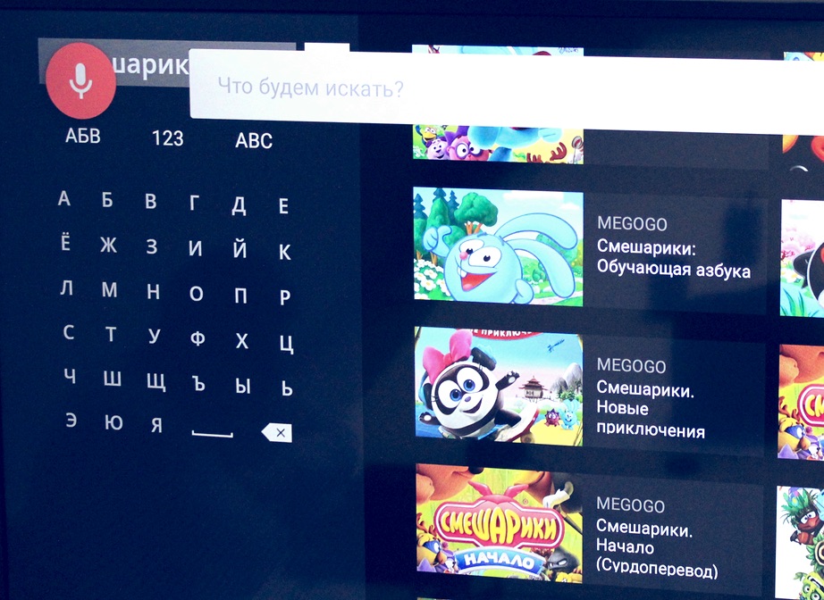 И можно не упарываться с клавишами вверх-вниз, набирая буквы, а просто голосом сообщить, что же такого нужно найти. "Смешариков" шайтан-поиск нашел влегкую и в один клик на пульте, где есть специальная кнопка с иконкой микрофона.