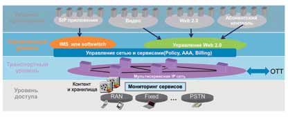 Современная архитектура IP NGN-сети представляет собой проекцию подобного рода блоков на существующую сеть, в которой каждый из уровней взаимоувязан с остальными и является основой для вышестоящего уровня; все это позволяет получить на выходе логичную и структурированную архитектуру, в которой каждый из компонентов решает определенный круг задач. В современной архитектуре IP NGN предусмотрено четыре основных уровня – уровень приложений, управляющий уровень, транспортный уровень и уровень доступа. Каждый из этих уровней объединяет различного рода блоки и обеспечивает необходимую функциональность для вышестоящих и нижестоящих уровней. Так, например, на управляющем уровне располагаются следующие компоненты: OSS/BSS-системы, подсистемы авторизации и аутентификации (AAA), Policy-сервера, IMS или softswitch’и, потребность в которых четко выражена как со стороны уровня приложений, так и со стороны транспортного уровня, а также уровня доступа. Фактически, придерживаясь подобного рода архитектуры, оператор способен обеспечить своих абонентов End-to-end-услугами, что в свою очередь порой является немаловажным фактором в конечном выборе поставщика услуг.