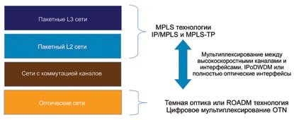 Оптические сети передачи данных, функционирующих на базе темной оптики или WDM-технологии, обеспечивающие высокоскоростные каналы связи для транзитного трафика. На первый взгляд, подобного рода сети требуют выделенной инфраструктуры, что в свою очередь ведет к увеличению расходов, связанных с обслуживанием, сопровождением и поддержкой данных сетей со стороны операторов связи. Более того, все чаще и чаще требуется обеспечить совместимость между отдельными сетями и сервисами, выполненными на базе подобного рода технологий и принципов построения. С другой стороны, внедрение дополнительных услуг, а также новейших технологий в некоторых случаях просто не представляется возможным из-за существующих ограничений и отсутствия прямой совместимости между данными технологиями. Среди подобного рода технологий и услуг можно выделить следующие сервисы: передача IPv6-трафика, передача голосовых и видеоданных, Carrier Ethernet, сервисы с возможностью эмуляции различного рода высокоскоростных каналов связи и топологий (например, E-LAN, E-TREE, E-LINE) и т.д. и т.п. К тому же, некоторые из данных технологий выполняют дублирующие функции, а операторы связи исторически вынуждены сопровождать соответствующие сети передачи данных.