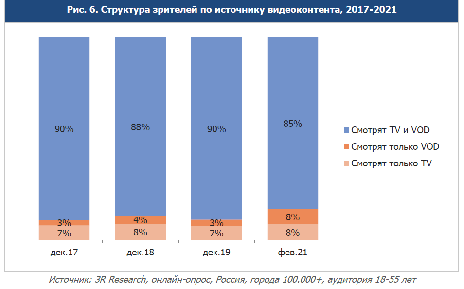2020 год принес много значимых изменений на рынке. Одним из них стал двукратный рост числа россиян, которые смотрят только видео по запросу и отказались от просмотра ТВ. Сейчас 85% ответивших смотрят ТВ и пользуются VOD-ресурсами, а 8% не включают телевизор, а смотрят видео только на VOD-сервисах.