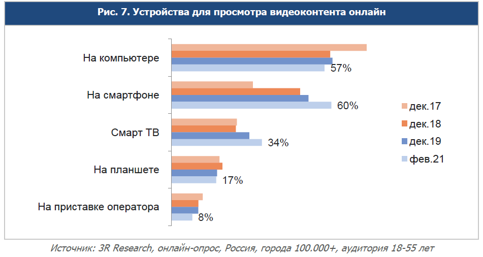 На следующем графике приведена структура ответов на вопросы об устройстве, при помощи которого респонденты смотрят видеоконтент (один человек мог указать любое количество устройств). Впервые мобильные устройства стали главным источником видео, увеличивается просмотр на Smart TV.