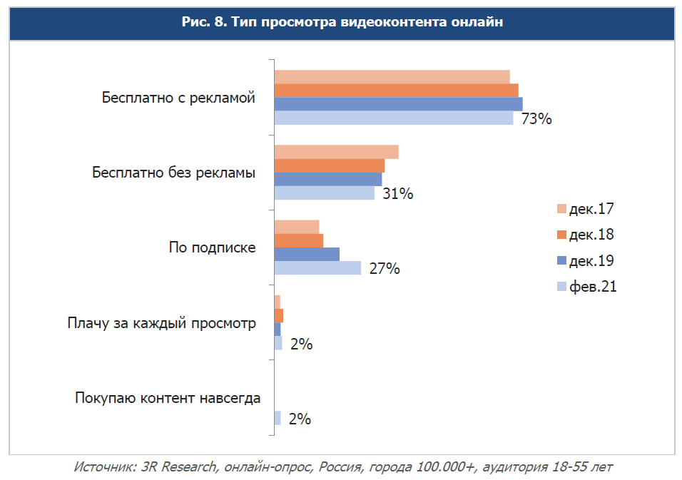 • Информацию, полученную в исследовании зрителей легальных видеосервисов (см. 2.5.1), что подписку в 2020 году оформили 27% жителей городов России с населением более 100.000 человек. В 2019 году этот показатель был на уровне 20%