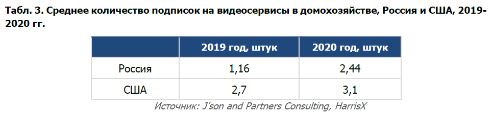 Тем менее бурный рост подписок на видеосервисы в России привел к тому, что увеличилось не только количество пользователей, но и число подписок на домохозяйство. По данным компании HarrisX в США одна семья имеет в среднем 3,1 подписки на видеосервисы. Для расчета такого же показателя в России необходимо учесть: