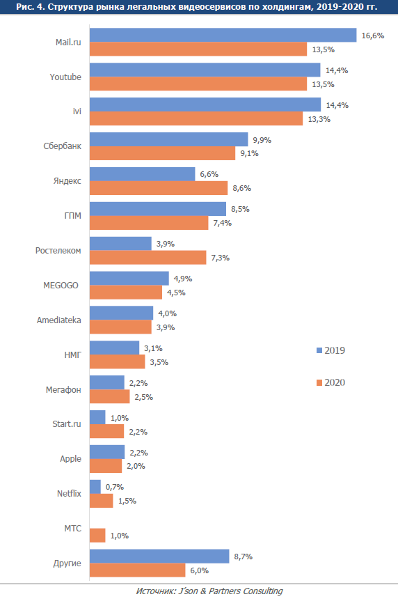 Рынок по результатам 2020 года продолжил оставаться высококонкурентным. Разница между тремя крупнейшими игроками практически нивелировалась. Однако лидерство сохранил Mail.ru, на второе место переместился Youtube, ivi занял третью позицию. Необходимо отметить, что в 2019 году на тройку лидеров приходилось в совокупности 45,4% всей выручки, а в 2020 году эта доля уменьшилась до 40,3%. На рынке есть компании, которые растут быстрее, поэтому уменьшилась доля "Другие" и из нее выделены отдельные холдинги.