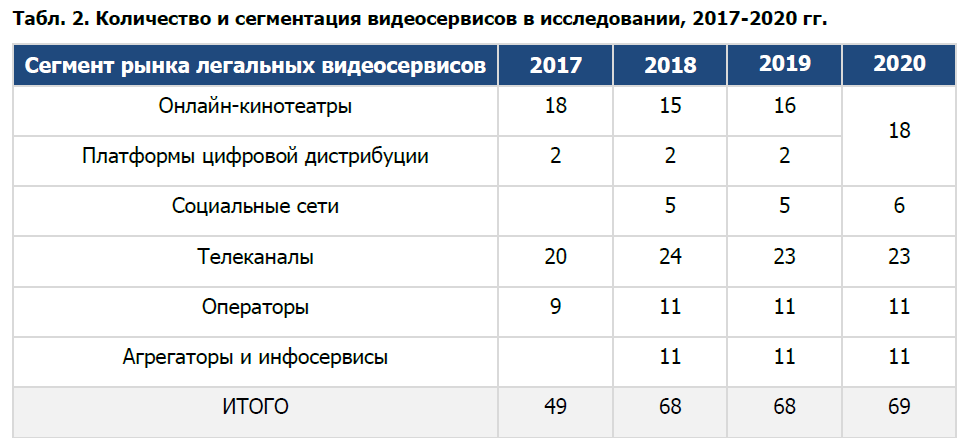 Важно подчеркнуть, что отнесение видеосервиса к тому или иному сегменту – прерогатива самой компании-владельца сервиса. Это определение происходит при заполнении анкеты, которая рассылается игрокам при сборе данных о рынке.