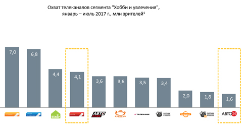1 - Тематическая ниша согласно общепринятой классификации тематик телеканалов, используемой национальным ТВ-измерителем Mediascope (ранее "TNS Россия", TNS Gallup Media). Источник данных – Mediascope, проект TV Index Plus, электронные измерения, Россия (совокупность городов 100 000+), январь – июль 2017 г., население 4+. Среднемесячный охват аудитории – среднее число зрителей, смотревших канал у себя дома хотя бы 1 минуту в месяц.