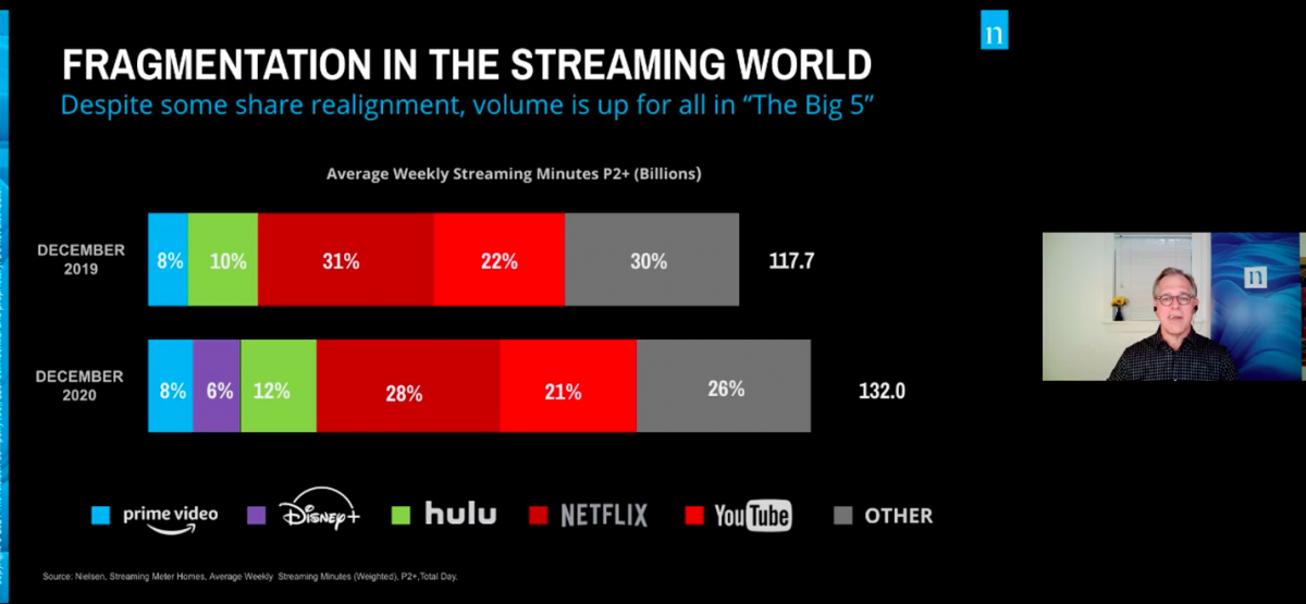 Но теперь встает вопрос о развитии брендов потокового вещания, которые продолжают острую конкуренцию друг с другом. Старший вице-президент по продуктовой стратегии аналитической компании Nielsen, на исследования которой мы неоднократно ссылались в наших статьях, Брайан Фюрер (Brian Fuhrer) поделился наиболее свежими данными показателей потокового видео и его динамики за прошедший год.