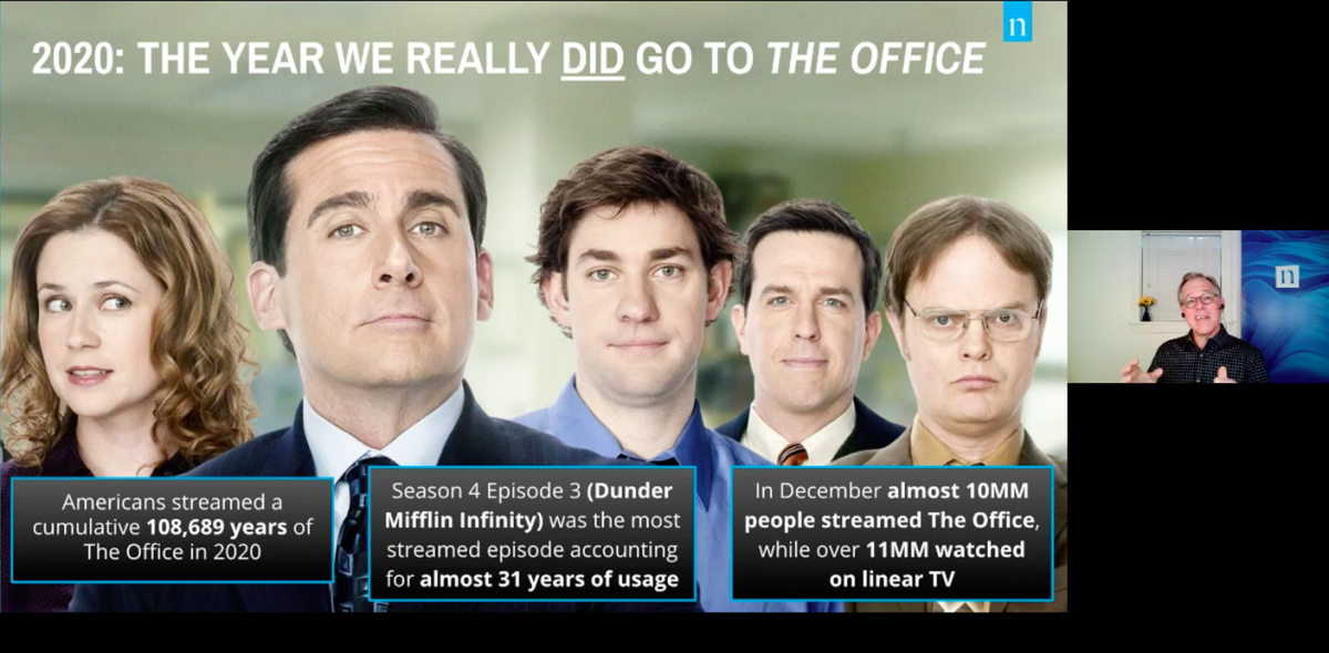На рис. (1) показано соотношение различных стриминговых платформ на конец 2019 и 2020 года. Видно, что Disney plus сделал более, чем успешный старт. Но вот что важно – и это Брайан подчеркнул – 8 из 10 наиболее востребованных стримов этой платформы – детские фильмы и программы. Их чрезвычайно полезная особенность (для правообладателей) в том, что дети просматривают любимый фильм или программу снова и снова, и, таким образом детский контент имеет долгую жизнь и оказывается более выгодным. А вот полным и абсолютным чемпионом по времени просмотра у взрослых стал сериал "Офис". По-видимому, людям остро не хватало офисной жизни и отсюда такой невероятный интерес к ее кинематографической эмуляции. (рис 2).