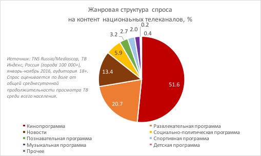 Жанровая структура спроса на контент, предъявляемого той или иной аудиторией, в долгосрочной перспективе достаточно стабильна. Потому что наши вкусы во многом связаны с нашими привычками. Если посмотреть на структуру потребления контента национальных (бесплатных) телеканалов, наиболее востребованным уже много лет оказывает киносериальный жанр, а второе и третье места занимают, соответственно, развлекательные программы и новости.
