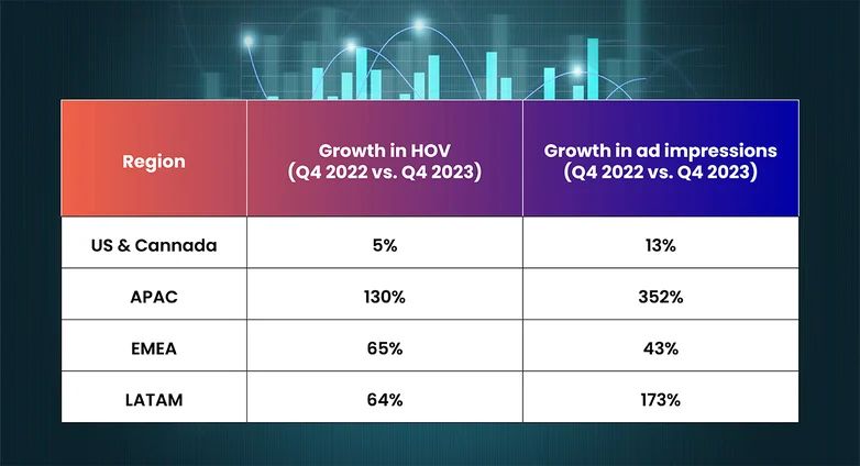 Согласно данным отчета Amagi, на мировом рынке FAST во II полугодии 2023-го был зафиксирован устойчивый рост показов рекламы по отношению ко II полугодию 2022-го – на 15% в III квартале и на 28% в IV квартале, количество просмотров FAST-каналов выросло на 45% и 25%, а время просмотра (HOV) – на 30% и 26% соответственно.