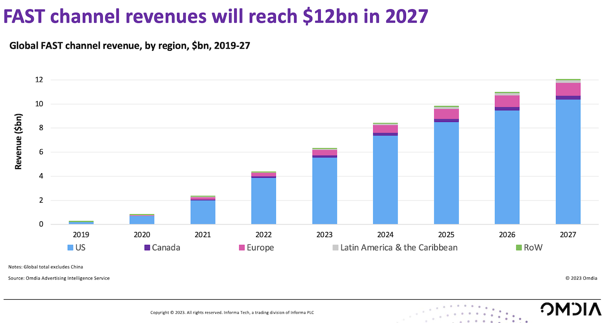 Данные исследовательской компании Omdia по итогам 2023 года, показывают, что FAST показывает уверенный рост во всем мире. Сейчас в США 46% пользователей еженедельно смотрят каналы FAST, в Бразилии – 36%, а в Великобритании – 21%. По прогнозам аналитиков, в 2024 году доходы на этом рынке достигнут $8 млрд. По прогнозам Digital TV Research, глобальные доходы от FAST в 2029 году достигнут $17 млрд.