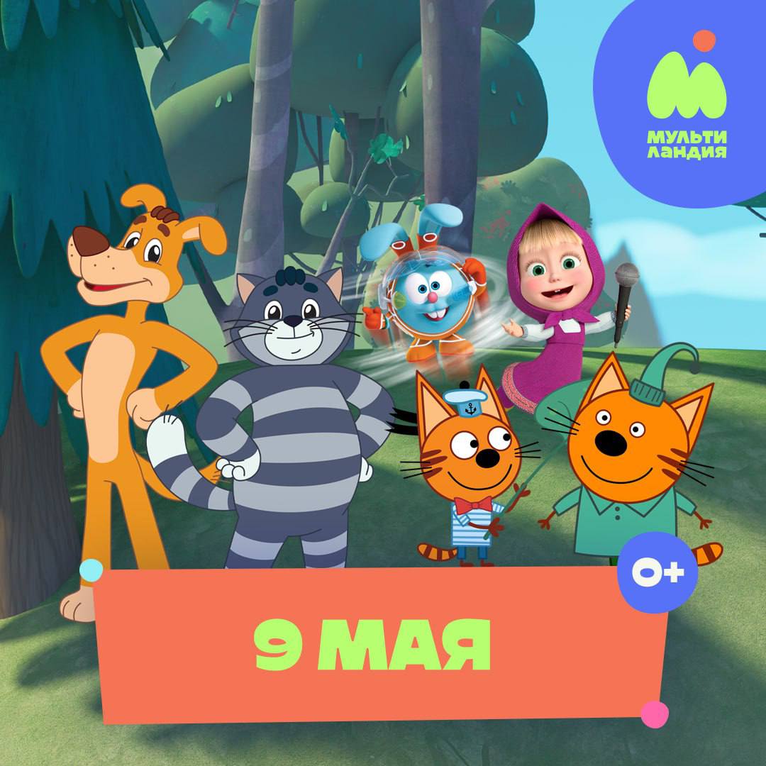 9 мая на телеканале "Мультиландия" начнется с марафона мультсериала "Смешарики: ПинКод". Затем зрителей ждет премьера: музыкальный сборник "Маша и Медведь. Песенки" порадует лучшими песнями из культового мультсериала. Также в этот день на телеканале пройдут марафоны мультсериалов "Простоквашино" и "Три кота".