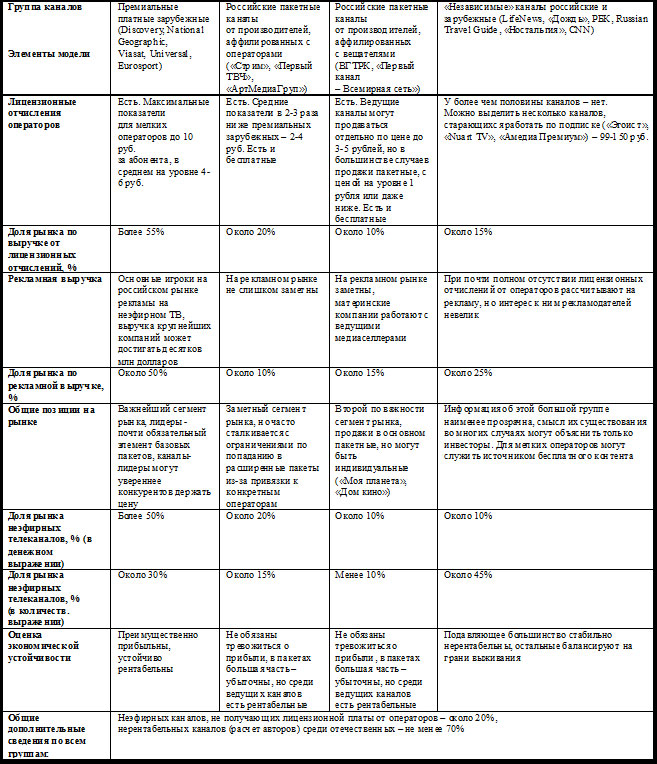 Таблица 1. Основные сегменты отрасли неэфирных телеканалов* (осень 2013 г.)