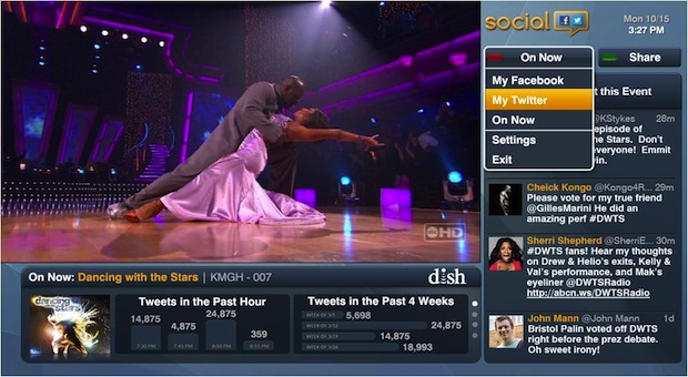 Так, недавно американский спутниковый провайдер Dish представил приложение «Social», которое позволяет одновременно и смотреть любимые телевизионные шоу, и общаться либо в Twitter, либо в Facebook. Для удобства пользователей весь контент подаётся на одном экране — телевизионная картинка на основной части экрана, а так называемый «social bar» — в специальном окне справа. В нём можно настроить показ одного из трёх видов социального контента — Twitter’а с его полным пользовательским функционалом, Facebook’а с аналогичными возможностями, а также ленты новостей или «твитов», связанных с ТВ-шоу или фильмом/сериалом, который в настоящий момент смотрит абонент. В Dish отмечают, что третий вид контента показывает актуальную информацию, даже когда пользователь смотрит ТВ-контент в записи.