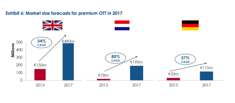 Предполагается, что рынок Великобритании вырастет с 110-130 млн фунтов (или с 173,5-205 млн долларов) в 2013 году до 390 млн фунтов (615 млн долларов) в 2017-ом, в Дании ожидается рост с 15-20 млн евро (18,7-25 млн долларов) в 2013-ом до 190 млн евро (237 млн долларов) в 2017 году. Менее значительный, но все же уверенный рост премиум ОТТ-рынка будет наблюдаться в Германии — с 30-35 млн евро (37-43,7 млн долларов) в 2013 до 117 млн евро (146 млн долларов) в 2017 году. Невысокий рост рынка в стране объясняется низким проникновением широкополосных сетей.