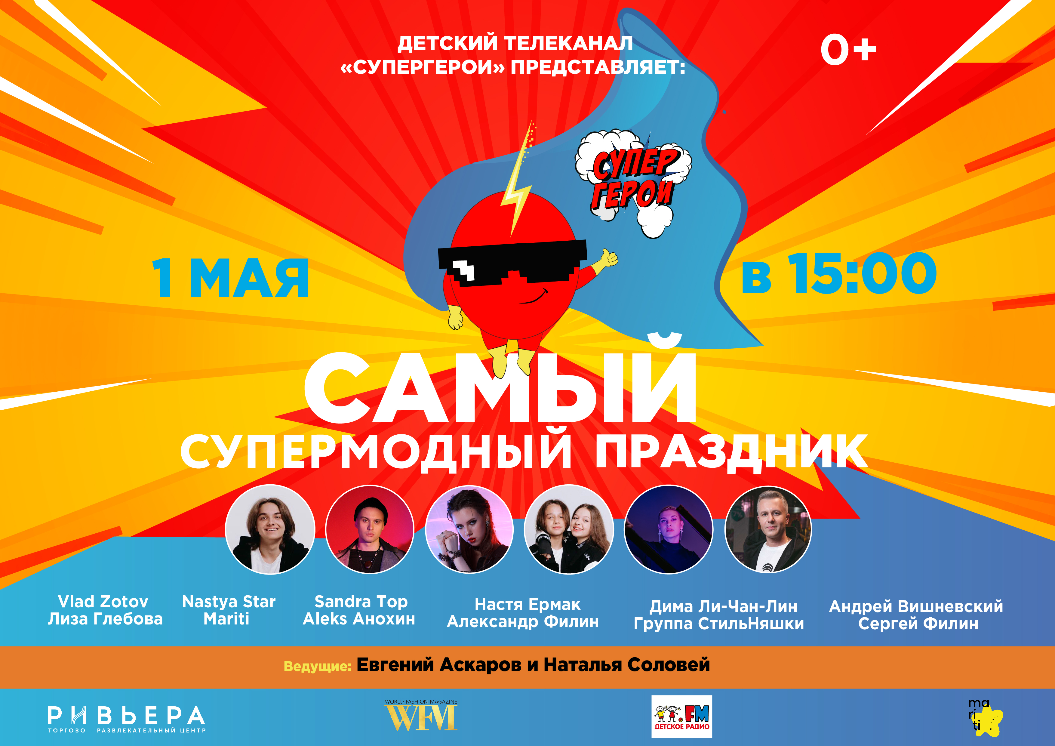 1 мая в 15:00 в ТРЦ "Ривьера" пройдет супермодный праздник для всей семьи от детского телеканала "СуперГерои" при поддержке международного издания "World Fashion Magazine" и "Детского радио". На сцене центрального атриума выступят Vlad Zotov, Лиза Глебова, Nastya Star, Mariti, Sandra Top, Дима Ли-Чан-Ли, Сергей и Александр Филины, Aleks Анохин и другие. Мастер Александр Вишневский покажет шоу "Хореография причесок", где прически создаются в танце. Вести праздник будут Наталья Соловей и Евгений Аскаров. СуперПиксель - супергерой, который является лицом телеканала, подготовил много ценных призов, которые он разыграет во время праздника от телеканала и партнеров. Среди призов наборы косметики, сертификаты от города профессий, мультимедийного парка развлечений и дрифт-картинга. А еще гостей ждет сладкая вата, веселые аниматоры и игры и мастер-класс по слаймам от "Slime Lab".