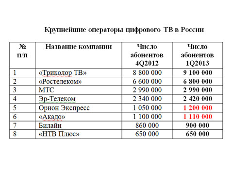 Основной приток абонентов в I квартале 2013 года пришёлся на компанию «Триколор ТВ», которая в указанный период подключила 300 тысяч абонентов. На втором месте укрепился «Ростелеком», за квартал увеличивший свою аудиторию на 200 тысяч абонентов. На третьем месте по приросту расположился «Орион Экспресс», заключивший договора со 150 тысячами абонентов.