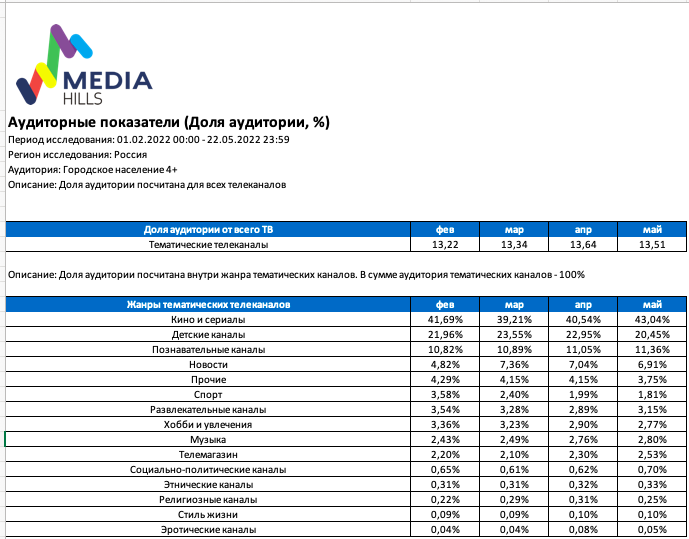Что касается тематического телевидения, то по данным MediaHills (все населенные пункты, 4+), несмотря на уход большого количества телеканалов, доля аудитории тематических каналов от всего ТВ в этом году практически не изменилась и даже немного выросла – от 13,22% в феврале до 13,52% в мае.