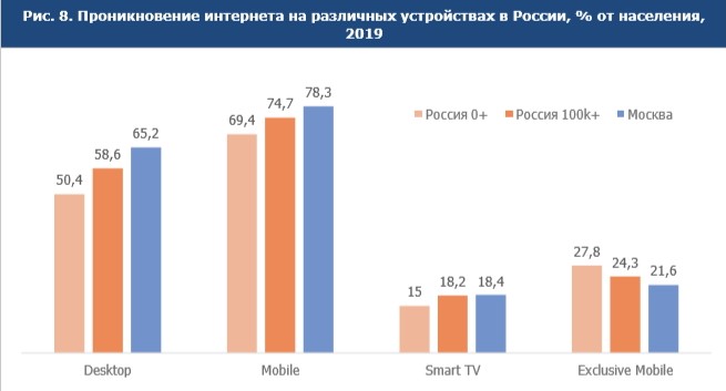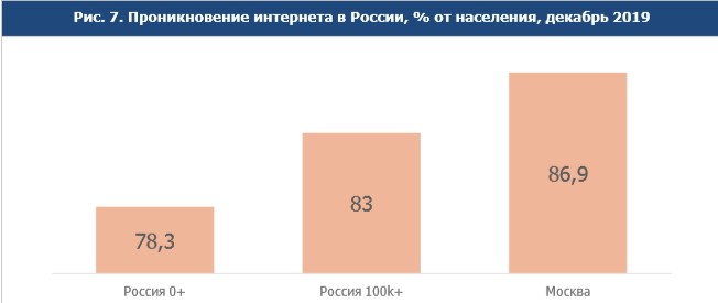 В России (измеряется постоянное население страны, за исключением Калининградской области, Республики Крым и Севастополя) 96 млн человек пользовались интернетом в 2019 году. Это составляет 78% жителей страны. Проникновение в процентах от населения в целом, по крупным городам (Россия 100к+) и столице представлено на рисунке ниже.