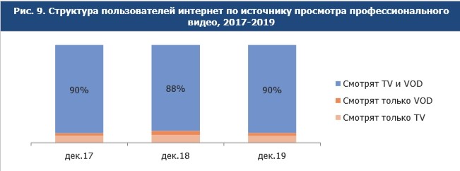 В декабре 2019 года компания J’son and Partners Consulting провела очередной онлайн-опрос жителей в городах России с населением от 100 тысяч человек. Ниже приведено сравнение с результатами, полученными по аналогичной методике в 2017-2018 годов. Значимых изменений в источнике получения профессионального видео не произошло. Порядка 90% ответивших смотрят ТВ и пользуются VOD-ресурсами; 4% не включают телевизор, а смотрят видео только на VOD-сервисах; 8% имеющих доступ к интернету не заходят на видеосервисы.