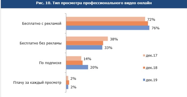 Три четверти опрошенных готовы терпеть рекламу, более трети используют торренты для скачивания видео (опция ответа "Бесплатно без рекламы"). Наиболее заметные изменения в результатах исследования произошли в отношении к подписке. Это исследование также фиксирует рост числа людей, которые готовы заплатить ежемесячный взнос за доступ к библиотеке контента видеосервиса – в 1,5 раза за последние 2 года (с 14% до 20% опрошенных).