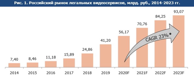 Пандемия коронавируса. Длительная изоляция дома большого количества людей привела к резкому росту спроса на легальное видео. По данным онлайн-кинотеатров и операторов среднесуточное количество просмотров за период январь-март 2020 года было равно пиковым значениям первой январской недели в обычный год. Такой высокий спрос должен привести к опережающему росту выручки подписной и транзакционной моделей в 2020 году.