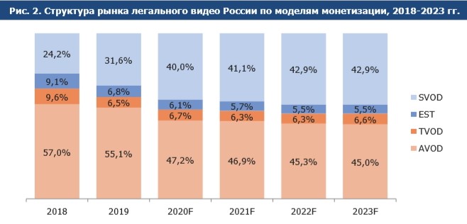 К 2023 году суммарные доли AVOD и SVOD будут сопоставимы, благодаря чему российский рынок по своей структуре будет похож на среднемировой.