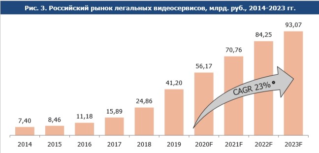 Общая выручка рынка легальных видеосервисов от предоставления услуг в России в 2019 году составила 41,2 млрд рублей без НДС.