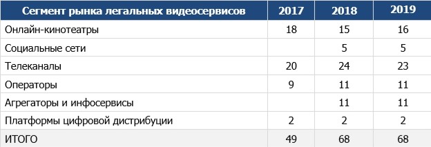 В соответствии с введенной в 2015 году сегментацией рынка легальных видеосервисов все компании, вошедшие в исследование, были разделены на следующие группы: