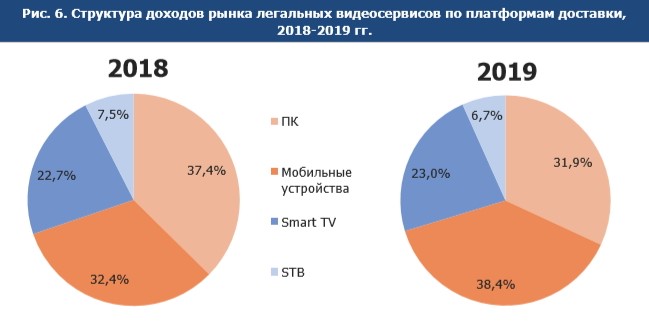 На рисунке ниже приведено изменение распределения доходов игроков рынка легальных видеосервисов по платформам доставки контента: Smart TV, персональные компьютеры, мобильные устройства, приставки (STB). Тренд на увеличение вклада мобильных устройств усилился.