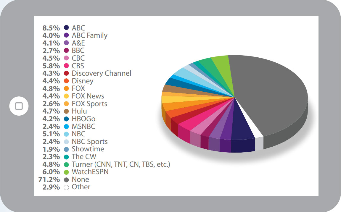Помимо сторонних приложений, пользователи частенько загружают, к примеру, приложения ТВ-вещателей. 28,8% опрошенных Digitalsmiths владельцев смартфонов и планшетов признались, что имеют на своём устройство одно и более подобных приложений. Самый популярный вариант — это приложение ABC (оно есть у 8,5% респондентов), следом идут A&E App (4,1%) и ABC Family App (4,0%).