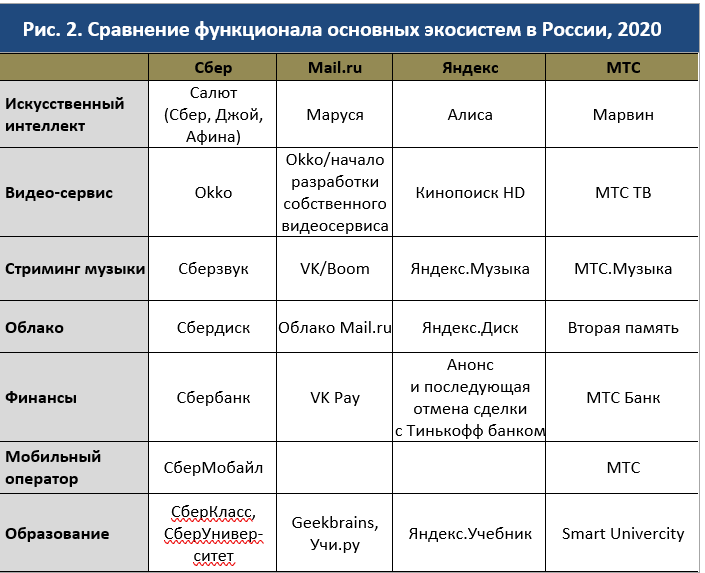 Полный список услуг в рамках единой подписки может быть любым и зависит только от возможностей компании в собственной разработке, ресурсов для сделок M&A или привлечения партнеров. Ниже приведено краткое сравнение основных экосистем на российском рынке.