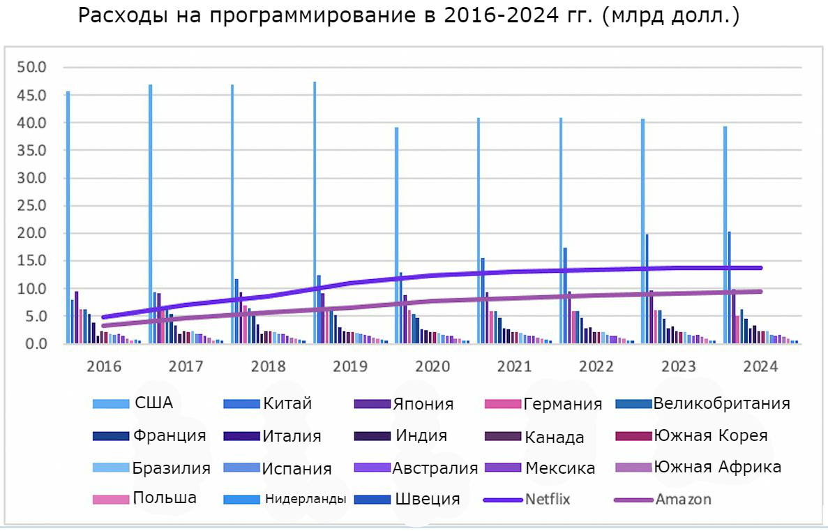 На долю одних только Amazon и Netflix пришлось 13,9% расходов. Эти компании увеличили свои инвестиции в производство контента на 2051%. Без учета этих двух платформ расходы по всему миру выросли на 23%.