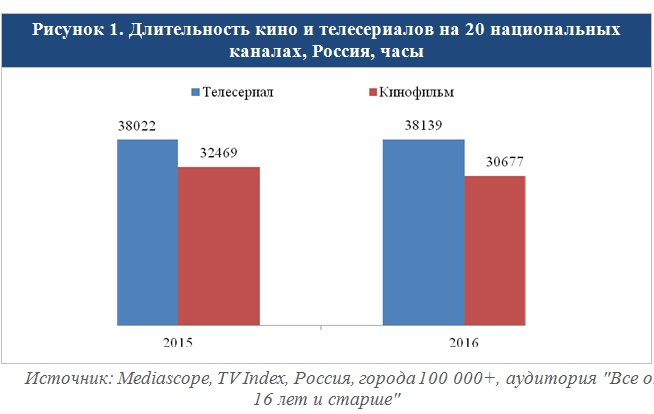 Если сравнить общий объем кинопоказа на федеральных каналах за 2015 и 2016 годы (см. рис. 1), можно заметить его падение на 6%. Крупные вещатели уменьшают количество фильмов не первый год по чисто экономическим причинам. Показ фильма стоит дорого, а аудитория и, как следствие, доходы конкретного фильма труднопрогнозируемы. Для сериалов все несколько проще – лояльная аудитория готова смотреть и пересматривать понравившийся продукт. В связи с этим недавнее объявление ТНТ о планах отказа от закупки голливудского кино в пользу собственных сериалов – это просто продолжение тренда. В свою очередь, длительность сериалов на ТВ практически не изменилась, так как для большинства каналов они являются основой сетки вещания.