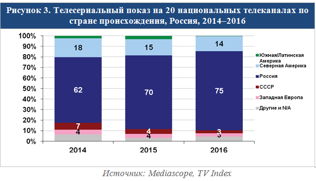 В сегменте телесериалов – полное доминирование отечественного контента, при этом его доля у крупных российских компаний растет и в 2016 году достигла 75%. Становится меньше как голливудских сериалов, так и продукции латиноамериканских и европейских производителей.