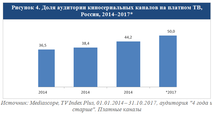 На платном ТВ тренд на протяжении многих лет не меняется. Ежегодно увеличивается число киносериальных каналов. По данным каталога "Кабельщика", в 2014 году их было 48, в 2015-м – 62, в 2016-м – 69. На ноябрь 2017 года общее число достигало 78. С 2014-го выросла и доля аудитории этого жанра среди платных каналов до 50% (см. рис. 4), то есть половину всего времени, которое зритель тратит на платное ТВ, он смотрит кино и сериалы.