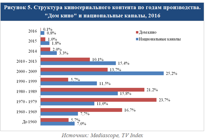 Крупнейшие российские каналы показывают прежде всего кинофильмы производства России/СССР (суммарно 47% в 2016 году) и Голливуда (42%). При этом заметен рост доли российского кино, которое ежегодно замещает советское. Увеличение доли американского кино в 2016-м объясняется изменением программной политики каналов СТС и "Пятница!", которые резко нарастили кинопоказ в 2016 году за счет фильмов этой страны.