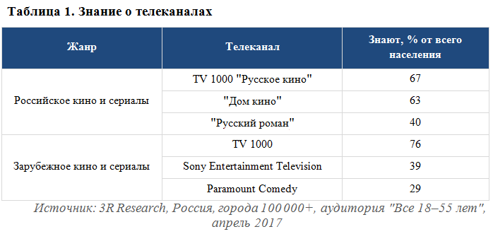 Операторы часто задают представителям платных телеканалов вопрос: "Знают ли зрители ваши киносериальные каналы и как к ним относятся?". На него дает ответ исследование, которое два раза в год проводит компания 3R Research. Респондентам, проживающим в городах страны с населением от 100 тысяч человек, предлагают вопросы о знании, качестве этого знания и отношении к каналу. Все вещатели разбиты на группы (кино и сериалы, познавательные, развлекательные и т.д.). Ниже в таблицах приведено несколько примеров по зарубежным и российским киносериальным каналам.
