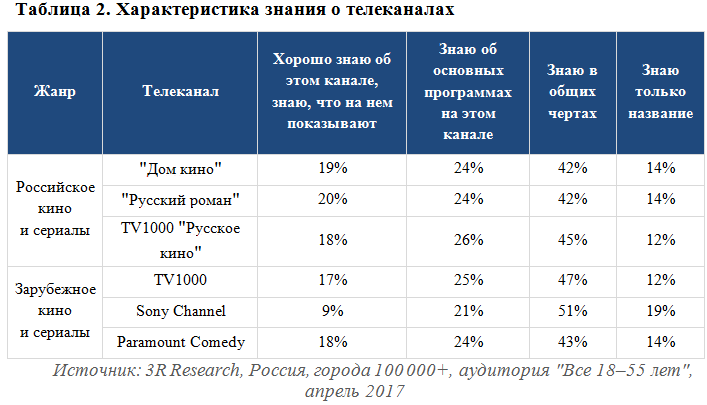 Сфокусироваться каждый канал должен не на увеличении просто общего знания о себе, а на знании о своих передачах. В идеале необходимо продвигать конкретные проекты (линейки) в конкретное время, чтобы сформировать у зрителя понимание, когда и что смотреть. Сейчас даже у каналов – лидеров по знанию в своих категориях от 42% до 51% знающих имеют о них самое общее представление, а 12–19% вообще знают только название (см. табл. 2).