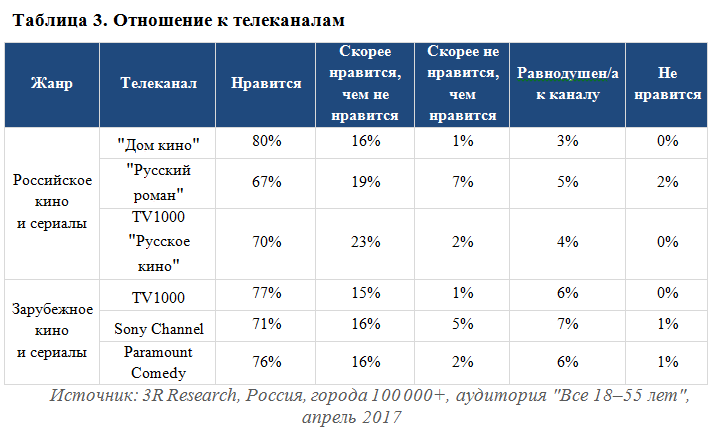 Но киносериальные каналы имеют довольно лояльных зрителей. Уровень одобрения среди тех, кто их смотрит, не опускается ниже 60%, равнодушных - от 3% до 7%. Результаты ответов "канал не нравится" находятся за пределами статистической погрешности (см. табл. 3).