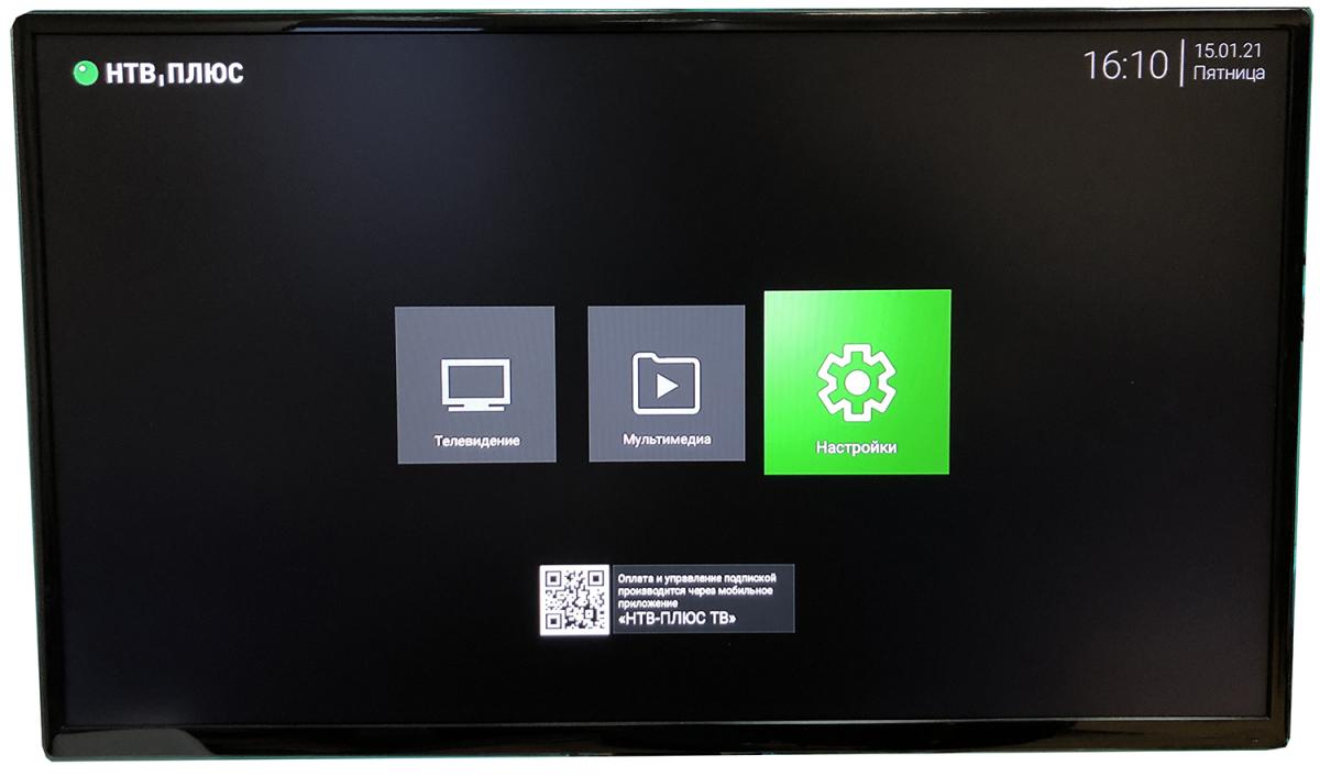 Главный экран предлагает меню из трех блюд: Телевидение, Мультимедиа, Настройки.