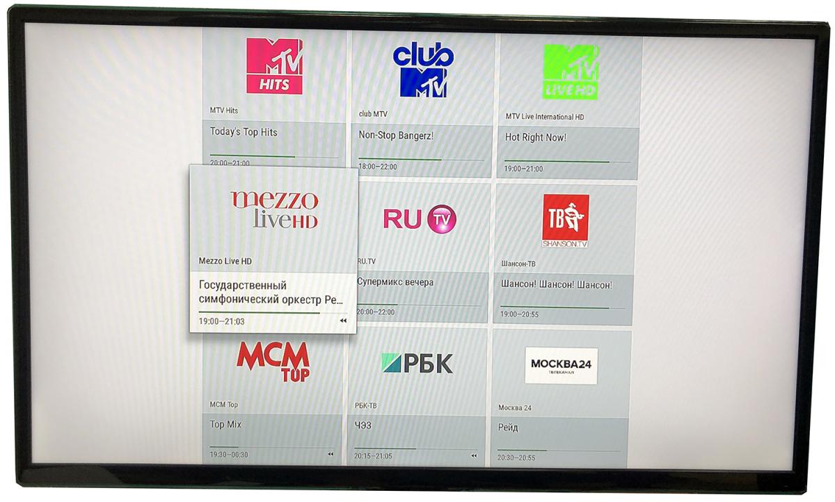 "Телевидение" проваливает в ТВ-каналы и VOD-контент, "Мультимедиа" открывает встроенный файл-менеджер и позволяет проигрывать медиаконтент с внешних устройств.