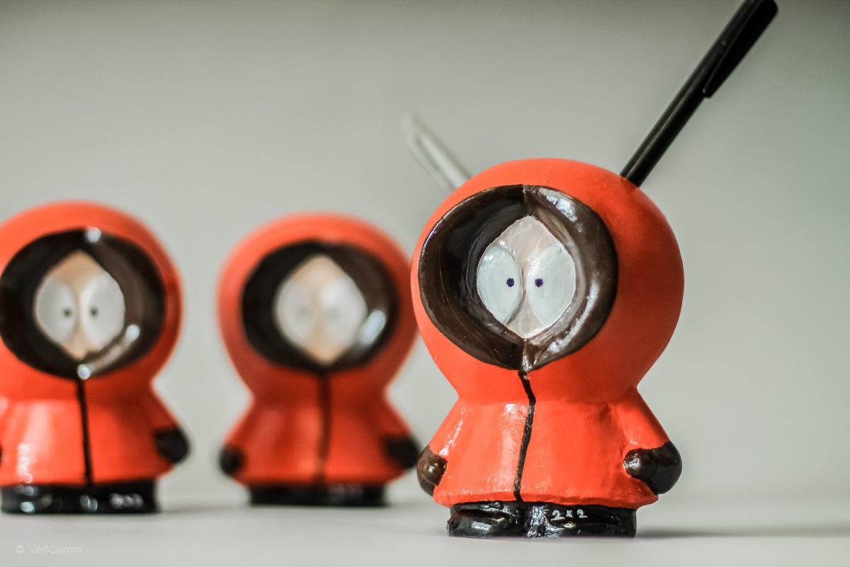 Что: черные скалки с белым логотипом 2х2 и подставки для карандашей в образе убитого Кенни.